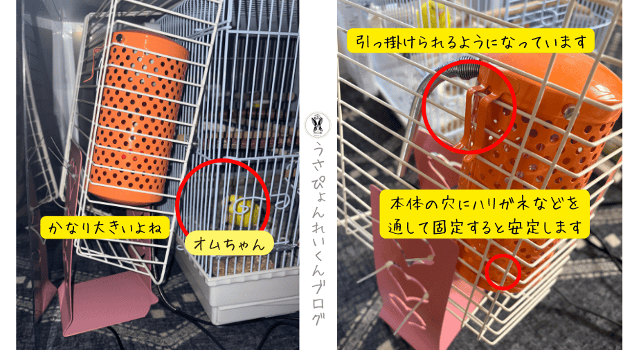外付けで使うことに決めましたが、100Wや60Wのように熱量が高い電球をケージに直接引っかける方法は、オムちゃんには危険だと感じました。