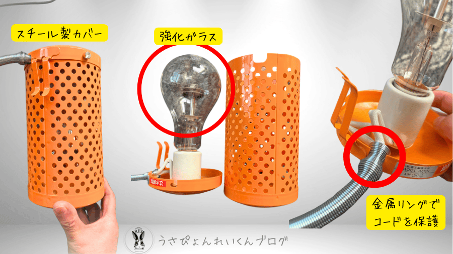 あさひのペットヒーター(保温電球)はスチール製のカバーで覆われているため、ペットのいたずらを防ぎやすく、安全面でも安心感があります。